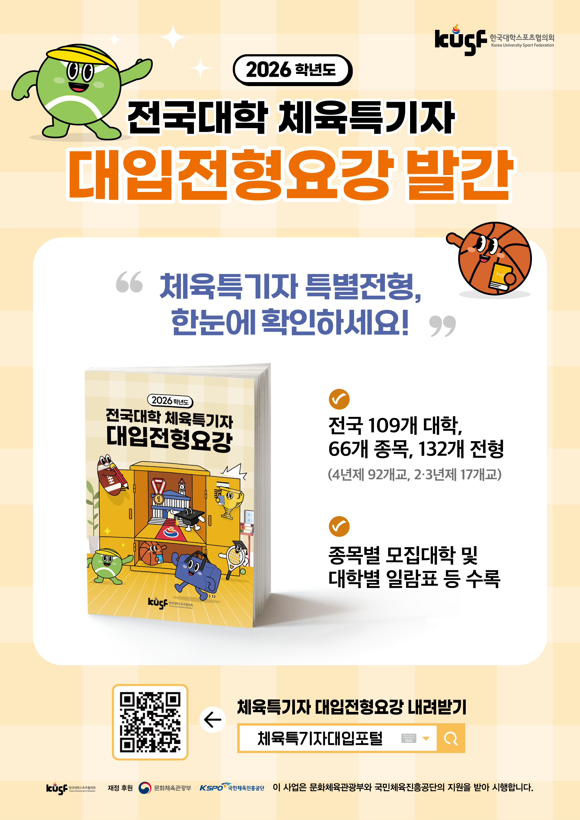 안녕하세요, 한국대학스포츠협의회(KUSF)입니다. ※ 요강 책자 개별 신청은 마감되었음을 알려드립니다. 많은 관심 감사드립니다. 2025년 8월 14일에 발간된 [2026학년도 전국대학 체육특기자 대입전형요강] 원문을 첨부하여 게재합니다. 체육특기자 전형으로 대입을 준비하는 학생선수와 학부모님, 입시관계자분들께 유용한 자료로 활용되길 바라겠습니다. * 인쇄된 책자는 8월 말 17개 시·도 운동부 운영 983개 고교, 138개 KUSF 회원대학, 대입 관련 기관 및 유관기관, 대한체육회 종목단체, 대면상담 참가자 대상으로 발송될 예정입니다. [2026년도 전국대학 체육특기자 대입전형요강] ㅇ 각 대학에서 발표한 '2026학년도 수시 모집요강' 편집·정리 - 4년제: 92개교 - 2·3년제: 17개교 ㅇ 대입전형요강 이해도를 높이기 위한 정보 제공 - 입시 용어, 2026학년도 체육특기자 대입전형 기본사항·전형특징·요강발간현황·활용가이드·체육특기자대입포털 안내 등 ㅇ 체육특기자 종목별 모집대학 수록 ㅇ 대학별 체육특기자 전형 요강을 요약한 대입전형요강 일람표 수록 ㅇ 전국 체육특기자 선발 대학의 '체육특기자 특별전형 대입전형요강' 수록 <유의사항> ※ 본 책자는 각 대학에서 공개한 '2026학년도 수시 모집요강'을 요약한 책자로, 대학별 세부내용은 해당 대학 입학처 사이트에서 최종 모집요강을 확인하시기 바랍니다. ※ 본 책자는 고등학교 입시생을 위한 교육적 정보 제공을 목적으로 발간 및 배포하고 있으며, 저작권법에 의거하여 무단 복제·배포를 금지합니다. ※ 기타 오류사항 발견 및 문의사항이 있으실 경우 아래 문의처로 연락바랍니다. * KUSF 기획총괄팀 이정은 대리(02-2135-4366 / Leee@kusf.or.kr) 감사합니다. |